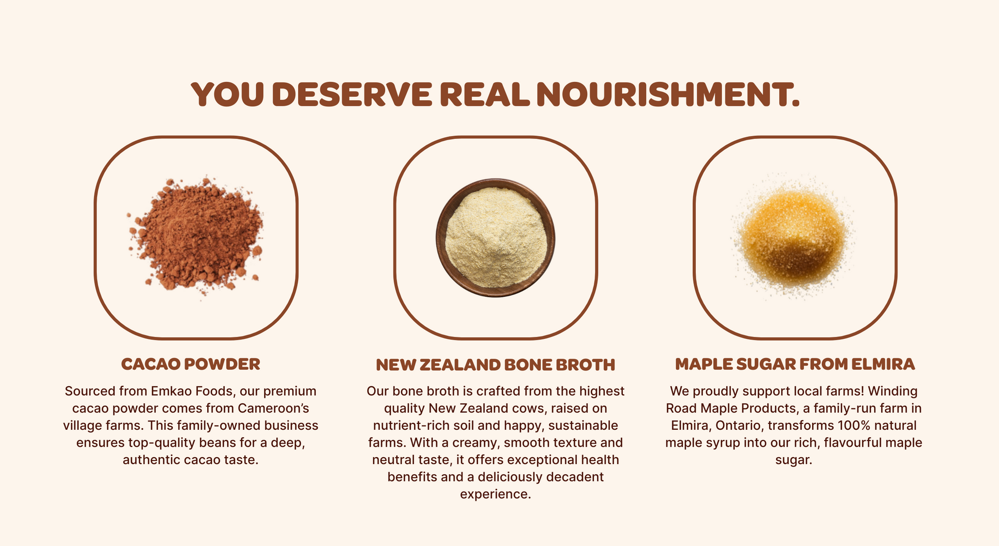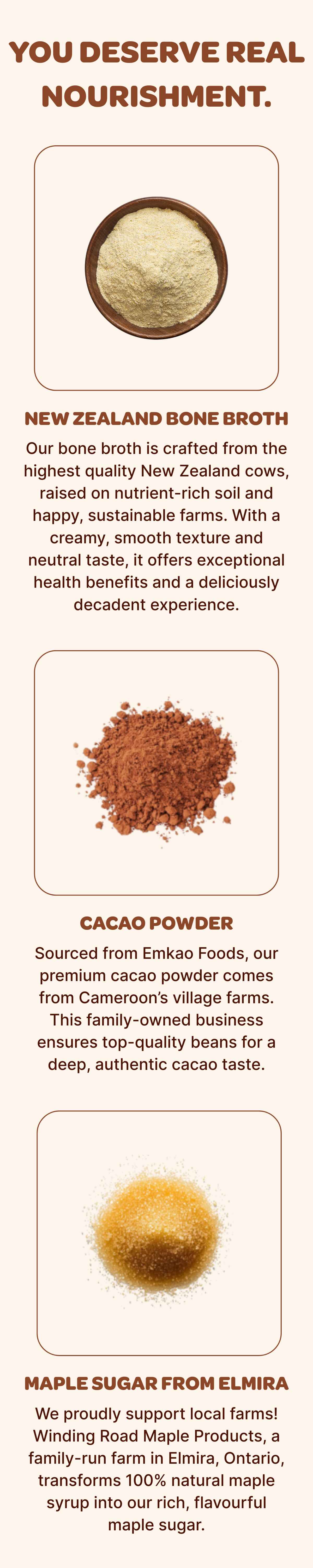 INGREDIENTS: Beef bone broth powder, Maple sugar, Cacao powder, Sea salt.